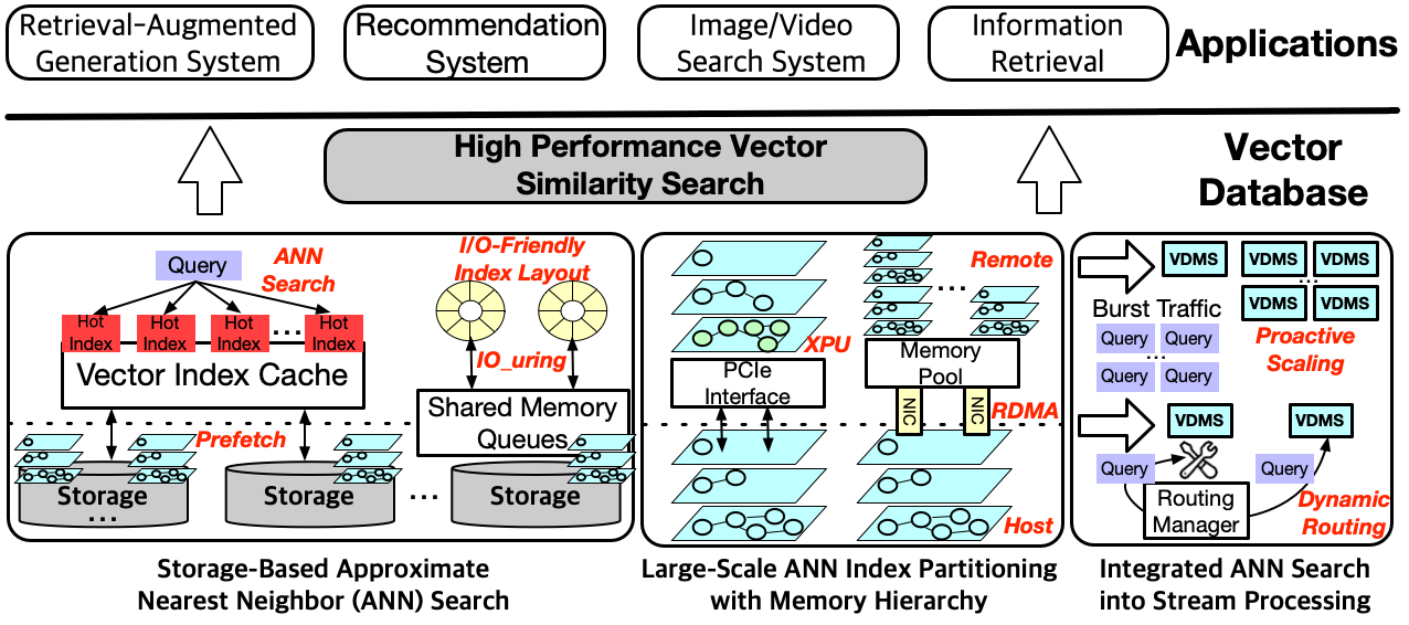 Modern AI applications such as RAG, recommendation systems, image/video search, and information retrieval increasingly rely on high-performance vector similarity search. However, existing vector databases often struggle to deliver consistently low latency and high throughput under billion-scale vector datasets or streaming scenarios. To address this issue, our research lab research is designing vector database architecture to handle large-scale vector datasets and production-level workloads including real-time traffic and updates. Our aim is to solve various problems and challenges that arise in storage-based approximate nearest neighbor (ANN) search, large-scale index partitioning with XPU and memory extension, and integrated ANN search into stream processing. Specifically, in storage-based ANN search, we design vector index cache that considers index access patterns and an I/O-friendly index layout to minimize disk I/O at runtime. Additionally, we conduct efficient ANN index partitioning with memory expansion using XPU and remote memory pooling systems. Finally, we are trying to integrate ANN search with stream processing engines, including Apache Spark and Kafka Streams. Overall, our goal is to achieve high performance vector similarity search by optimizing these underlying vector database architectures, thereby accelerating real-world AI and big data analytics workloads.