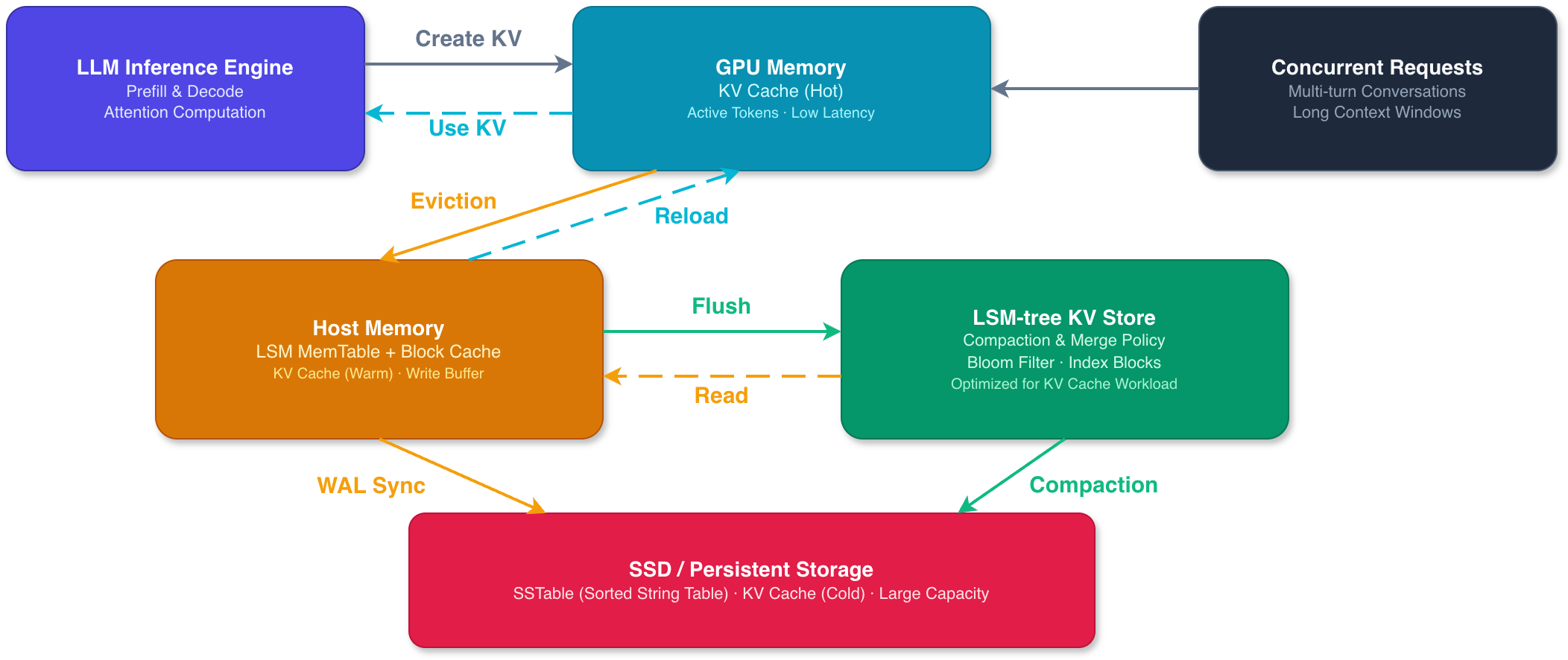 In modern large language model (LLM) inference, KV cache has emerged as a critical component that directly governs response latency and throughput. Particularly in scenarios involving long context windows, multi-turn conversations, and high concurrency, the KV cache size rapidly exceeds GPU memory capacity, and failure to manage it efficiently leads to increased inference latency and degraded throughput. To address these challenges, our research lab is investigating the use of LSM (Log-Structured Merge-tree) based key-value stores as an external storage backend for LLM KV cache. The LSM-tree architecture is inherently optimized for write-heavy workloads, making it a natural fit for the frequent insertion and eviction patterns of KV cache operations. Specifically, we analyze KV cache access patterns generated during LLM inference and optimize the compaction policies, cache hierarchy, and read/write paths of the LSM key-value store to better accommodate KV cache workloads. Additionally, we design an efficient data placement and migration strategy for KV cache across a multi-tier storage hierarchy spanning GPU memory, host memory, and SSDs. Ultimately, our goal is to optimize the storage and retrieval performance of LSM-based key-value stores for LLM serving environments, thereby building an LLM inference infrastructure capable of efficiently handling long contexts and large-scale concurrent requests under limited hardware resources.