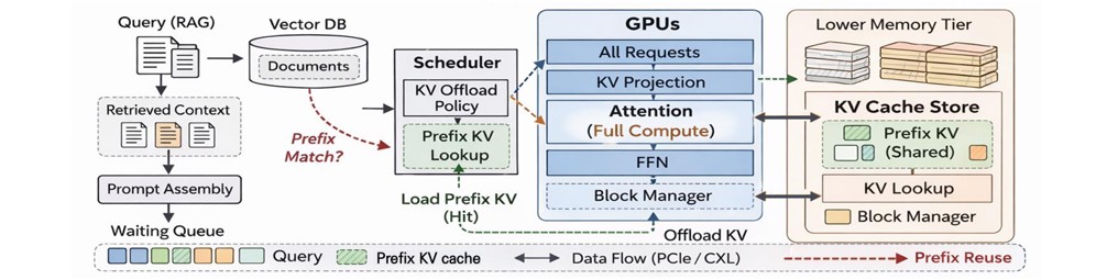 However, RAG-based LLM serving introduces significant system-level challenges. The tight coupling between retrieval and generation stages leads to complex data movement patterns, substantial GPU resource consumption, and high memory bandwidth demands. In particular, the KV (Key-Value) cache generated during inference occupies a large fraction of GPU memory, limiting concurrency and introducing overhead when memory tiering across CPU or storage is required.